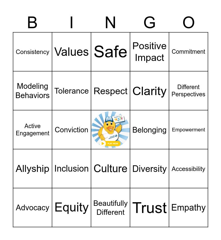 This bingo card has a free space and 24 words: Inclusion, Equity, Respect, Advocacy, Commitment, Consistency, Modeling Behaviors, Values, Belonging, Culture, Clarity, Active Engagement, Diversity, Accessibility, Tolerance, Trust, Empowerment, Safe, Different Perspectives, Conviction, Empathy, Allyship, Positive Impact and Beautifully Different.