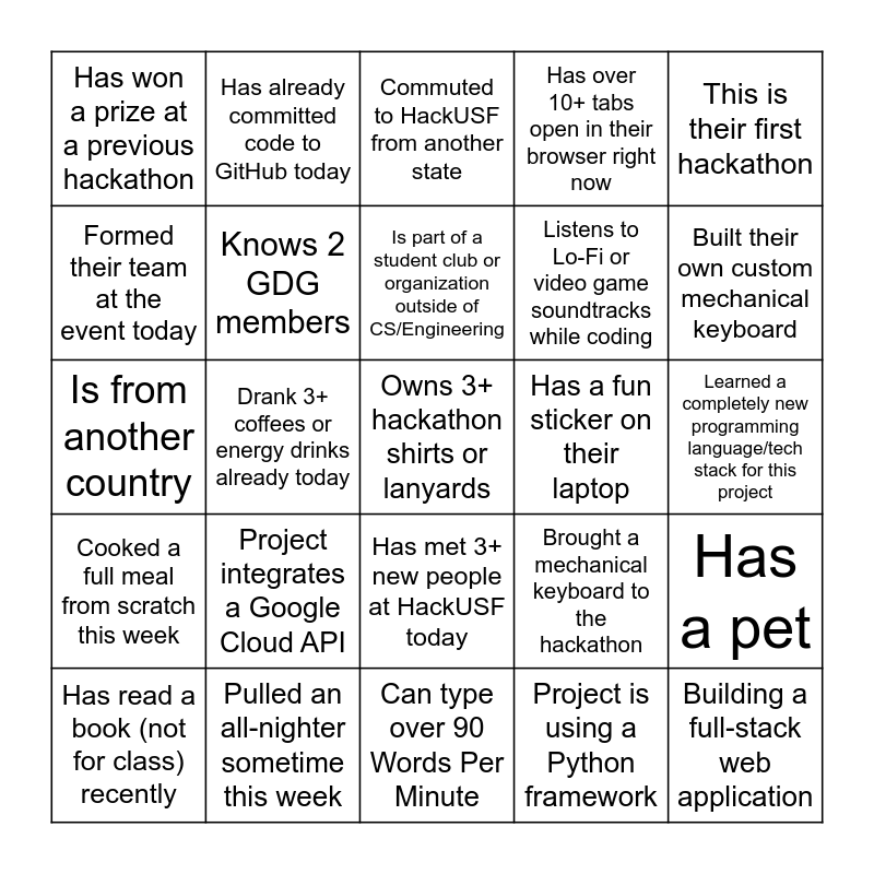 This bingo card has a free space and 32 words: Project is using a Python framework, Loves karaoke, Drank 3+ coffees or energy drinks already today, Project uses 2+ unique AI/LLM API keys, Cooked a full meal from scratch this week, Knows 2 GDG members, This is their first hackathon, Has a pet, Has already committed code to GitHub today, Can say "hello" in 3 languages, Is part of a student club or organization outside of CS/Engineering, Commuted to HackUSF from another state, Has already been to USF GDG events before, Has sent a message in the HackUSF Discord channel today, Has a fun sticker on their laptop, Has traveled to 3+ states, Has read a book (not for class) recently, Is from another country, Has met 3+ new people at HackUSF today, Project integrates a Google Cloud API, Brought a mechanical keyboard to the hackathon, Has participated in HackUSF 2025, Learned a completely new programming language/tech stack for this project, Pulled an all-nighter sometime this week, Building a full-stack web application, Has over 10+ tabs open in their browser right now, Listens to Lo-Fi or video game soundtracks while coding, Formed their team at the event today, Has won a prize at a previous hackathon, Can type over 90 Words Per Minute, Has seen snow in person and Built their own custom mechanical keyboard.