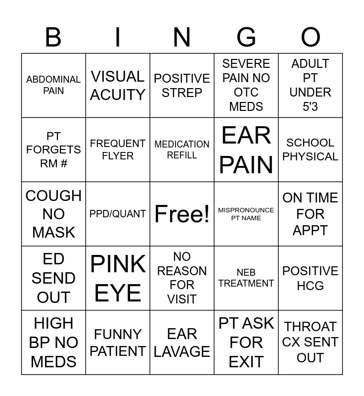 This bingo card has a free space and 24 words: PINK EYE, FUNNY PATIENT, MEDICATION REFILL, HIGH BP NO MEDS, ADULT PT UNDER 5'3, ABDOMINAL PAIN, PT FORGETS RM #, VISUAL ACUITY, MISPRONOUNCE PT NAME, NO REASON FOR VISIT, EAR PAIN, COUGH NO MASK, NEB TREATMENT, POSITIVE HCG, FREQUENT FLYER, PT ASK FOR EXIT, ON TIME FOR APPT, POSITIVE STREP, SCHOOL PHYSICAL, PPD/QUANT, THROAT CX SENT OUT, ED SEND OUT, SEVERE PAIN NO OTC MEDS and EAR LAVAGE.