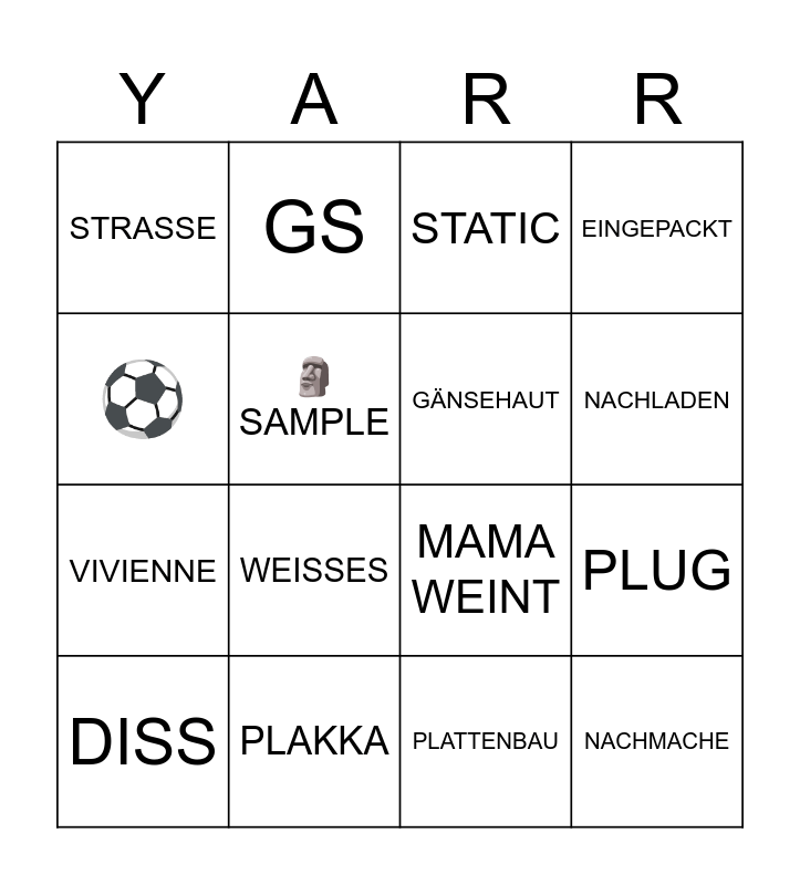 This bingo card has 16 words: PLAKKA, PLUG, STATIC, STRASSE, VIVIENNE, GS, MAMA WEINT, PLATTENBAU, ⚽, 🗿SAMPLE, DISS, EINGEPACKT, WEISSES, NACHLADEN, GÄNSEHAUT and NACHMACHE.