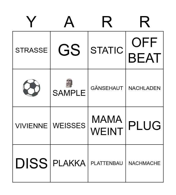 This bingo card has 16 words: PLAKKA, PLUG, STATIC, STRASSE, VIVIENNE, GS, MAMA WEINT, PLATTENBAU, ⚽, 🗿SAMPLE, DISS, OFF BEAT, WEISSES, NACHLADEN, GÄNSEHAUT and NACHMACHE.