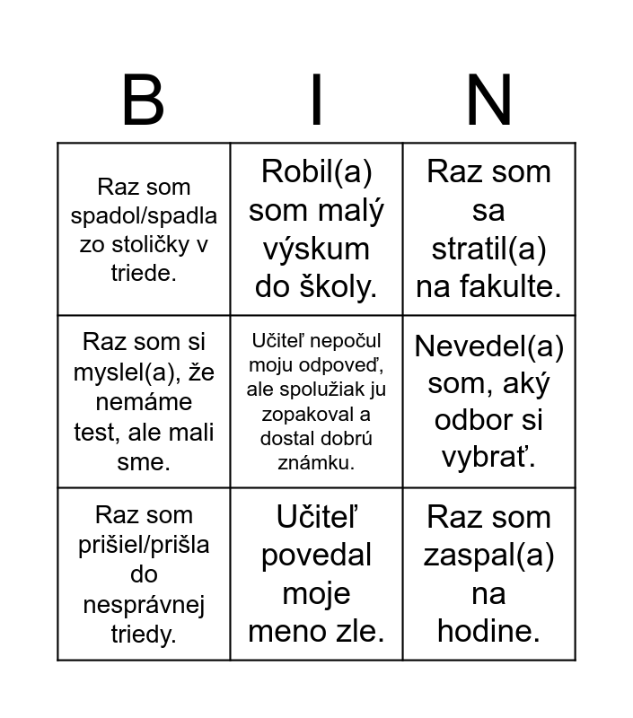 This bingo card has a free space and 8 words: Nevedel(a) som, aký odbor si vybrať., Raz som sa stratil(a) na fakulte., Robil(a) som malý výskum do školy., Raz som prišiel/prišla do nesprávnej triedy., Raz som spadol/spadla zo stoličky v triede., Raz som zaspal(a) na hodine., Raz som si myslel(a), že nemáme test, ale mali sme. and Učiteľ povedal moje meno zle..