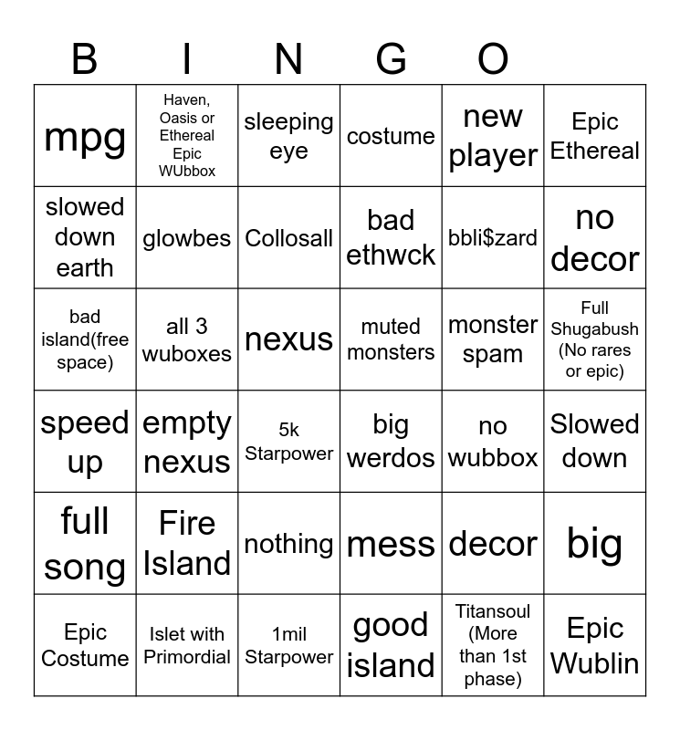 This bingo card has 36 words: mess, nothing, good island, slowed down earth, speed up, muted monsters, glowbes, 1mil Starpower, new player, decor, no decor, costume, big, all 3 wuboxes, bad ethwck, mpg, full song, monster spam, bad island(free space), sleeping eye, nexus, empty nexus, big werdos, 5k Starpower, no wubbox, Haven, Oasis or Ethereal Epic WUbbox, bbli$zard, Islet with Primordial, Collosall, Epic Ethereal, Epic Wublin, Epic Costume, Slowed down, Full Shugabush (No rares or epic), Fire Island and Titansoul (More than 1st phase).
