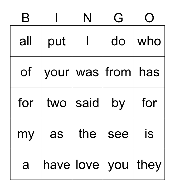 This bingo card has 25 words: my, have, said, you, who, all, put, I, by, is, of, your, love, see, has, a, two, was, from, for, for, as, the, do and they.