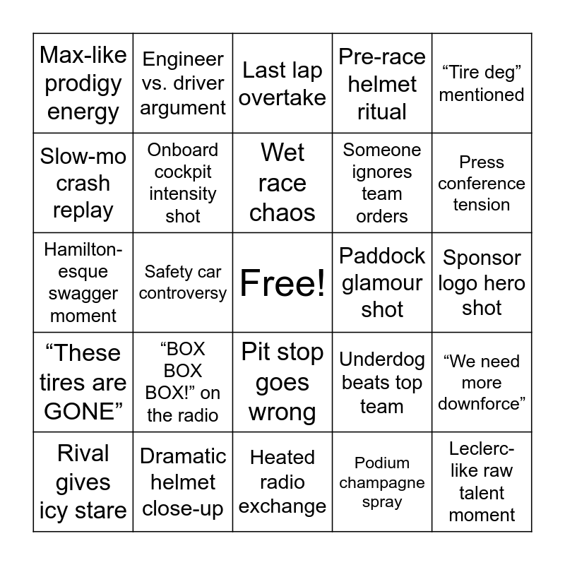 This bingo card has a free space and 24 words: “BOX BOX BOX!” on the radio, Dramatic helmet close-up, Wet race chaos, Rival gives icy stare, “Tire deg” mentioned, Max-like prodigy energy, Slow-mo crash replay, Engineer vs. driver argument, Paddock glamour shot, Pit stop goes wrong, Someone ignores team orders, Hamilton-esque swagger moment, Underdog beats top team, “We need more downforce”, Onboard cockpit intensity shot, Podium champagne spray, Sponsor logo hero shot, Last lap overtake, Press conference tension, Safety car controversy, Leclerc-like raw talent moment, “These tires are GONE”, Pre-race helmet ritual and Heated radio exchange.