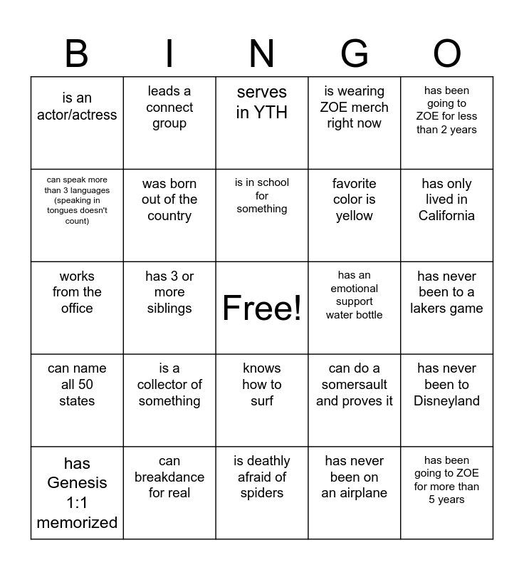 This bingo card has a free space and 26 words: knows how to surf, has never been on an airplane, is in school for something, can breakdance for real, has been going to ZOE for less than 2 years, is an actor/actress, can speak more than 3 languages (speaking in tongues doesn't count), leads a connect group, has never been to a lakers game, can do a somersault and proves it, favorite color is yellow, works from the office, has never been to Disneyland, has Genesis 1:1 memorized, has 3 or more siblings, has kids, is wearing ZOE merch right now, can name all 50 states, serves in YTH, has been going to ZOE for more than 5 years, has only lived in California, is deathly afraid of spiders, has an emotional support water bottle, is a collector of something, was born out of the country and has had a pet fish.