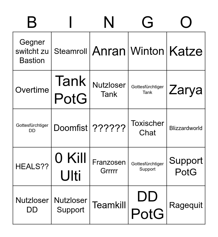 This bingo card has a free space and 24 words: 0 Kill Ulti, Nutzloser Support, Nutzloser Tank, Nutzloser DD, Katze, Gegner switcht zu Bastion, Overtime, Steamroll, Toxischer Chat, Franzosen Grrrrr, Gottesfürchtiger Tank, Gottesfürchtiger DD, Gottesfürchtiger Support, Support PotG, Tank PotG, DD PotG, Blizzardworld, Anran, Zarya, Doomfist, Ragequit, HEALS??, Winton and Teamkill.