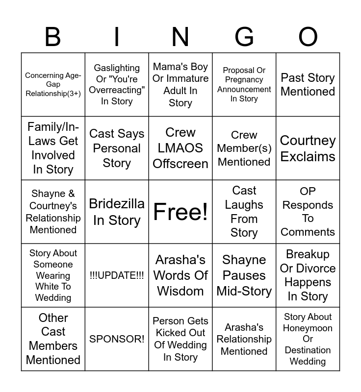This bingo card has a free space and 24 words: !!!UPDATE!!!, SPONSOR!, Crew LMAOS Offscreen, Other Cast Members Mentioned, Past Story Mentioned, Concerning Age-Gap Relationship(3+), Family/In-Laws Get Involved In Story, Gaslighting Or "You're Overreacting" In Story, Cast Laughs From Story, Arasha's Words Of Wisdom, Crew Member(s) Mentioned, Shayne & Courtney's Relationship Mentioned, Shayne Pauses Mid-Story, Breakup Or Divorce Happens In Story, Cast Says Personal Story, Arasha's Relationship Mentioned, OP Responds To Comments, Mama's Boy Or Immature Adult In Story, Courtney Exclaims, Bridezilla In Story, Story About Honeymoon Or Destination Wedding, Story About Someone Wearing White To Wedding, Proposal Or Pregnancy Announcement In Story and Person Gets Kicked Out Of Wedding In Story.