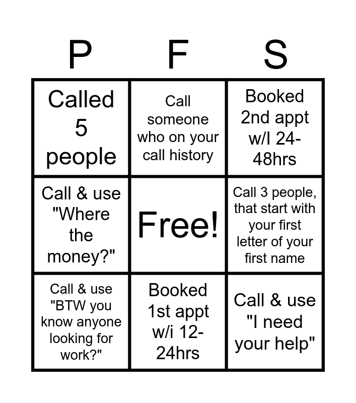 This bingo card has a free space and 10 words: Booked 1st appt w/i 12-24hrs, Booked 2nd appt w/I 24-48hrs, Called 5 people, Call & use "I need your help", Call & use "Where the money?", Call & use "BTW you know anyone looking for work?", Call someone who on your call history, Call someone who has at least 2 kids, Call 3 people, that start with your first letter of your first name and Call 3 people, that start with your first letter of your last name.