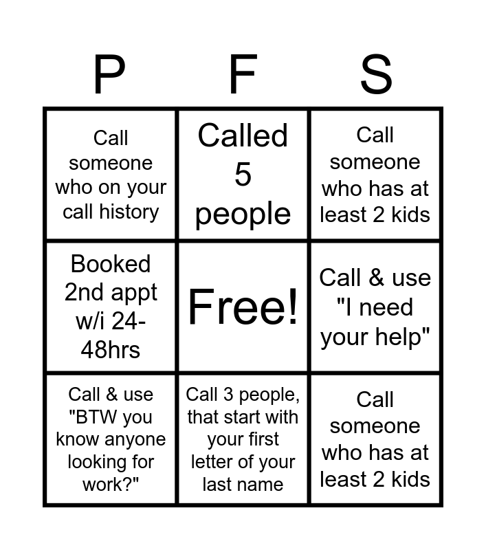 ⚠ This card has duplicate items: Booked 1st appt w/i 12-24hrs (2), Called 5 people (2), Call & use "I need your help" (2), Call & use "Where the money?" (2), Call & use "BTW you know anyone looking for work?" (2), Call someone who on your call history (2), Call someone who has at least 2 kids (2), Call 3 people, that start with your first letter of your first name (2), Call 3 people, that start with your first letter of your last name (2)