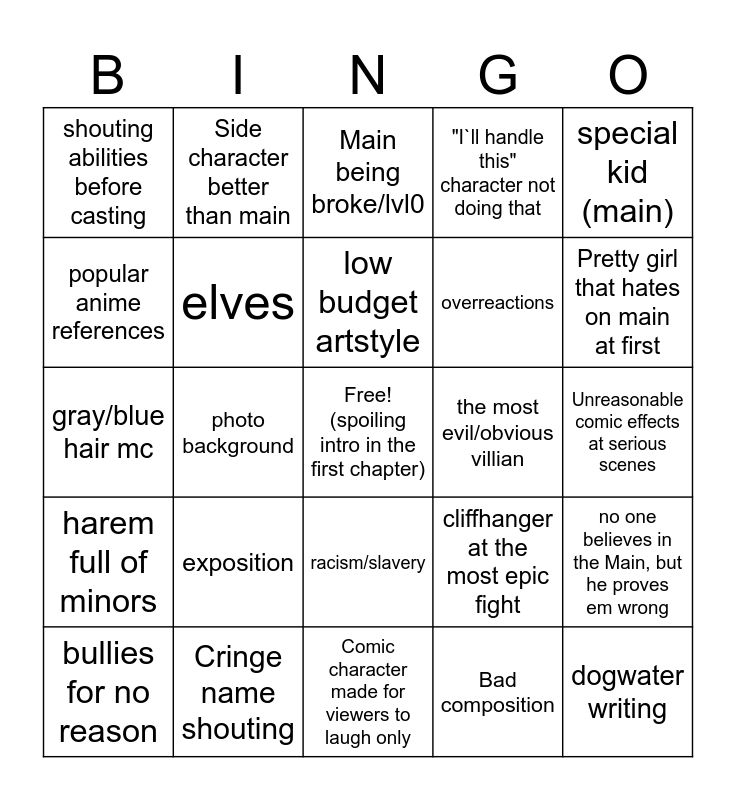 This bingo card has a free space and 24 words: exposition, Cringe name shouting, low budget artstyle, bullies for no reason, special kid (main), shouting abilities before casting, popular anime references, Side character better than main, the most evil/obvious villian, racism/slavery, overreactions, gray/blue hair mc, cliffhanger at the most epic fight, no one believes in the Main, but he proves em wrong, elves, Bad composition, Unreasonable comic effects at serious scenes, Main being broke/lvl0, Pretty girl that hates on main at first, photo background, dogwater writing, harem full of minors, "I`ll handle this" character not doing that and Comic character made for viewers to laugh only.