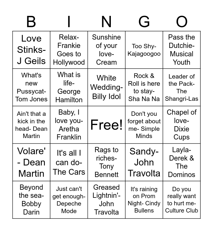 This bingo card has a free space and 52 words: Grease- Frankie Valli, Do you really want to hurt me- Culture Club, Hold me now- Thompson Twins, Greased Lightnin'- John Travolta, It's all I can do- The Cars, Summer Nights- John Travolta & Olivia Newton John, Relax- Frankie Goes to Hollywood, Hopelessly Devoted to you- Olivia Newton John, What's new Pussycat- Tom Jones, Space age love song- A Flock of Seagulls, What is life- George Hamilton, You're the one that I want- Olivia Newton John & John Travolta, Layla- Derek & The Dominos, Sandy- John Travolta, China Girl- David Bowie, Blue Moon- Sha Na Na, White Wedding- Billy Idol, Don't you forget about me- Simple Minds, Beauty School Dropout- Frankie Avalon, Pass the Dutchie- Musical Youth, Baby, I love you- Aretha Franklin, It's raining on Prom Night- Cindy Bullens, Love Stinks- J Geils, Rock & Roll is here to stay- Sha Na Na, Born to Hand Jive- Sha Na Na, Gimmie Shelter- The Rolling Stones, Tears on my Pillow- Sha Na Na, You spin me right round- Dead or Alive, Leader of the Pack- The Shangri-Las, Der Kommissar- After the Fire, Look at me I'm Sandra Dee- Stockard Channing, Too Shy- Kajagoogoo, Today I met the boy I'm going to marry- Darlene Love, We go together- Olivia Newton John & John Travolta, Private Idaho-The B52's, Sunshine of your love- Cream, Just can't get enough- Depeche Mode, Changes- David Bowie, Jam on it- Newcleus, I am the Walrus- The Beatles, My Girl- The Temptations, Chapel of love- Dixie Cups, Volare' - Dean Martin, The way you look tonight- Steve Tyrell, Rags to riches- Tony Bennett, Then he kissed me- The Crystals, Roses are red- Bobby Vinton, Ain't that a kick in the head- Dean Martin, Pretend you don't see her- Jerry Vale, Remember (Walkin in the sand)- The Shagri-Las, Beyond the sea- Bobby Darin and Monkey Man- The Rolling Stones.
