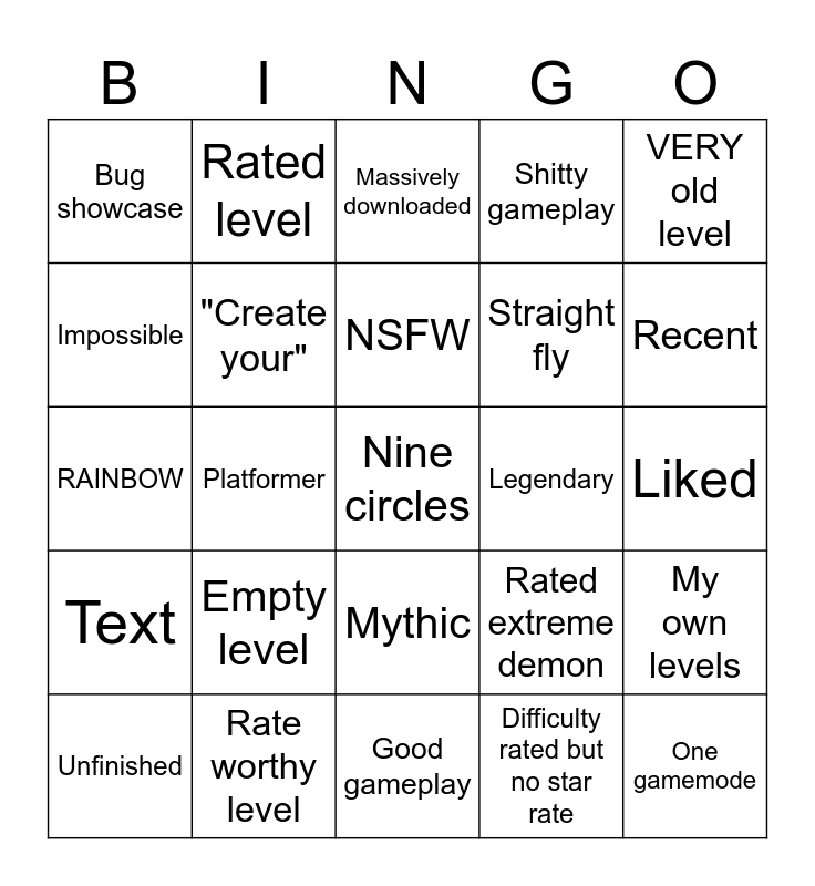 This bingo card has a free space and 24 words: Empty level, Rate worthy level, NSFW, Unfinished, VERY old level, Bug showcase, Impossible, Rated level, Legendary, Mythic, Straight fly, RAINBOW, Rated extreme demon, My own levels, "Create your", Difficulty rated but no star rate, Liked, Massively downloaded, Recent, Platformer, One gamemode, Text, Shitty gameplay and Good gameplay.