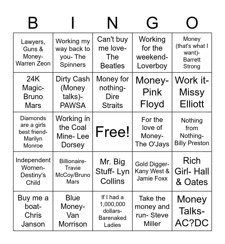 This bingo card has a free space and 47 words: Takin Care of business- Bachman Turner OVerdrive, Money Talks- AC?DC, 9 to 5- Dolly Parton, If I had a 1,000,000 dollars- Barenaked Ladies, Billionaire- Travie McCoy/Bruno Mars, Money, Money, Money-ABBA, Working my way back to you- The Spinners, Workin for a living-Huey Lewis & The News, 24K Magic- Bruno Mars, She works hard for the money- Donna Summer, Dirty Cash (Money talks)- PAWSA, Working for the weekend- Loverboy, Rich Girl- Hall & Oates, Gold Digger- Kany West & Jamie Foxx, Material Girl- Madonna, Song for the Count- Count Von Count (Sesame Street), Money for nothing- Dire Straits, For the love of Money- The O'Jays, Stuck in the middle with you- Stealers Wheels, Money (that's what I want)- Barrett Strong, Working in the Coal Mine- Lee Dorsey, Take the money and run- Steve Miller, Lawyers, Guns & Money- Warren Zeon, Money- Pink Floyd, Taxman- The Beatles, Work it- Missy Elliott, Buy me a boat- Chris Janson, Livin for the City- Stevie Wonder, Mr. Big Stuff- Lyn Collins, Independent Women- Destiny's Child, Singed, Sealed, Delivered- Stevie Wonder, Hold on I'm Comin- Sam & Dave, Smooth Operator- Sade, Price Tag- Jessie J, Royals- Lorde, Blue Money- Van Morrison, Nothing from Nothing- Billy Preston, You can get it if you really want- Jimmy Cliff, Mo Money Mo Problems- Notorious B.I.G., Money Changes everything- Cyndi Lauper, Love don't cost a thing- Jennifer Lopez, Can't buy me love- The Beatles, Diamonds are a girls best friend- Marilyn Monroe, Movin on Up- M People, Reach out, I'll be there- Four Tops, Pennies from Heaven- Louis Prima and take that to the bank- Shalamar.