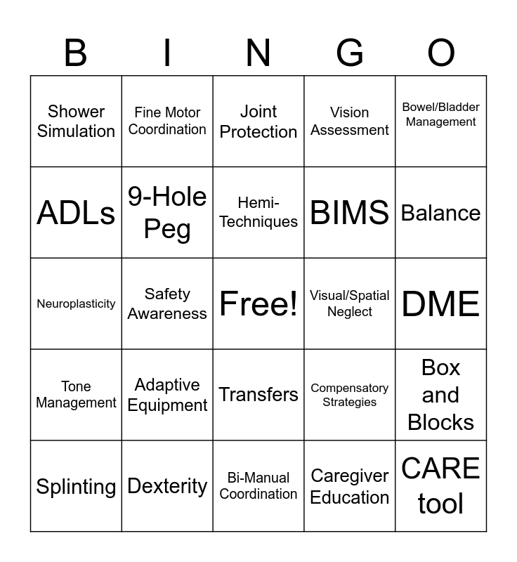 This bingo card has a free space and 24 words: Adaptive Equipment, Dexterity, Hemi-Techniques, Splinting, Bowel/Bladder Management, Shower Simulation, ADLs, Fine Motor Coordination, Visual/Spatial Neglect, Transfers, BIMS, Neuroplasticity, Compensatory Strategies, Box and Blocks, 9-Hole Peg, Caregiver Education, DME, Joint Protection, Balance, Safety Awareness, CARE tool, Tone Management, Vision Assessment and Bi-Manual Coordination.