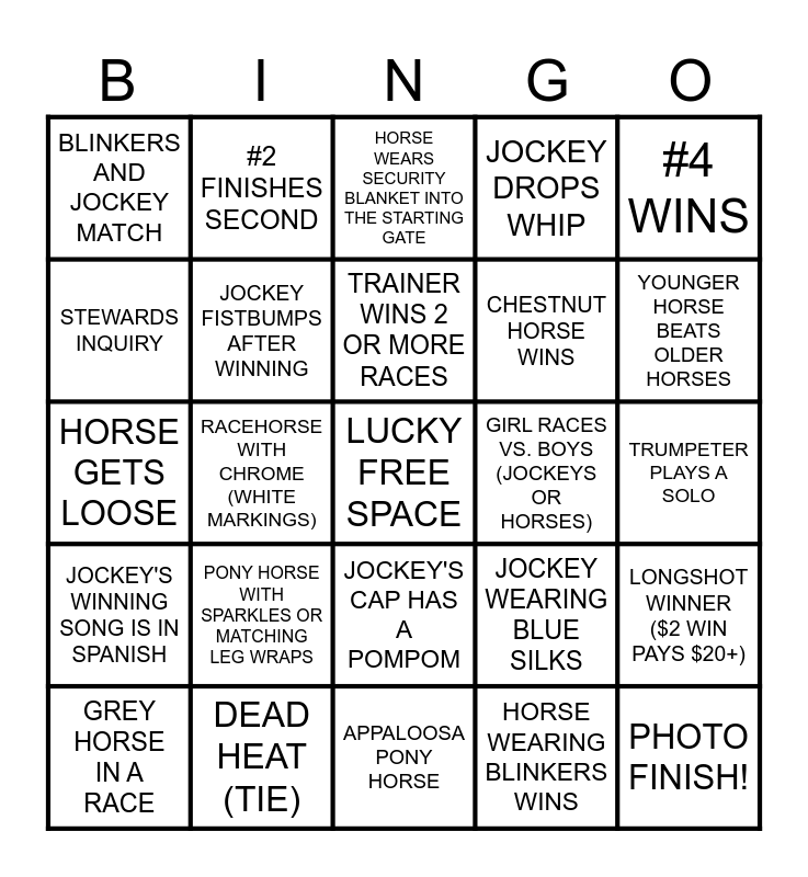 This bingo card has a free space and 24 words: GREY HORSE IN A RACE, PONY HORSE WITH SPARKLES OR MATCHING LEG WRAPS, TRAINER WINS 2 OR MORE RACES, HORSE WEARING BLINKERS WINS, #4 WINS, BLINKERS AND JOCKEY MATCH, #2 FINISHES SECOND, HORSE WEARS SECURITY BLANKET INTO THE STARTING GATE, GIRL RACES VS. BOYS (JOCKEYS OR HORSES), TRUMPETER PLAYS A SOLO, HORSE GETS LOOSE, JOCKEY FISTBUMPS AFTER WINNING, JOCKEY WEARING BLUE SILKS, LONGSHOT WINNER ($2 WIN PAYS $20+), STEWARDS INQUIRY, DEAD HEAT (TIE), APPALOOSA PONY HORSE, JOCKEY DROPS WHIP, YOUNGER HORSE BEATS OLDER HORSES, JOCKEY'S WINNING SONG IS IN SPANISH, RACEHORSE WITH CHROME (WHITE MARKINGS), JOCKEY'S CAP HAS A POMPOM, CHESTNUT HORSE WINS and PHOTO FINISH!.