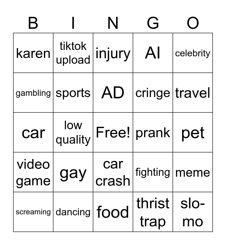 This bingo card has a free space and 24 words: gay, dancing, AD, screaming, celebrity, karen, gambling, tiktok upload, prank, car crash, cringe, car, fighting, meme, sports, thrist trap, pet, injury, travel, low quality, slo-mo, video game, AI and food.