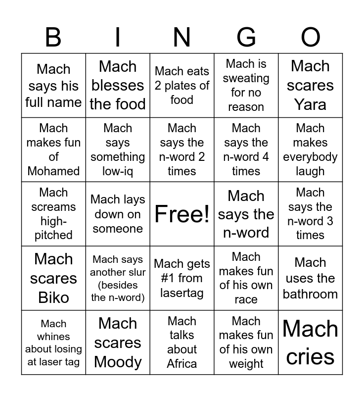 This bingo card has a free space and 24 words: Mach says another slur (besides the n-word), Mach scares Moody, Mach says the n-word 2 times, Mach whines about losing at laser tag, Mach scares Yara, Mach says his full name, Mach makes fun of Mohamed, Mach blesses the food, Mach says the n-word, Mach gets #1 from lasertag, Mach says the n-word 4 times, Mach screams high-pitched, Mach makes fun of his own race, Mach uses the bathroom, Mach says something low-iq, Mach makes fun of his own weight, Mach says the n-word 3 times, Mach eats 2 plates of food, Mach makes everybody laugh, Mach lays down on someone, Mach cries, Mach scares Biko, Mach is sweating for no reason and Mach talks about Africa.