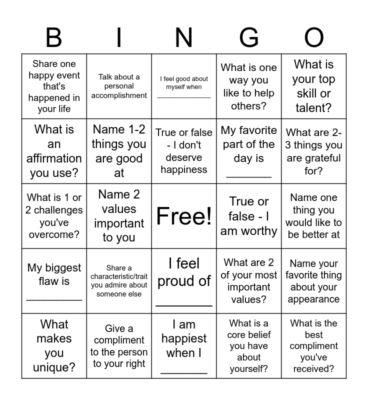 This bingo card has a free space and 24 words: What makes you unique?, Share a characteristic/trait you admire about someone else, True or false - I don't deserve happiness, What is a core belief you have about yourself?, What is your top skill or talent?, Share one happy event that's happened in your life, Talk about a personal accomplishment, I feel good about myself when _______________, True or false - I am worthy, Name one thing you would like to be better at, What is 1 or 2 challenges you've overcome?, Name 1-2 things you are good at, What are 2 of your most important values?, Name your favorite thing about your appearance, What is an affirmation you use?, Give a compliment to the person to your right, I am happiest when I _______, What is one way you like to help others?, What are 2-3 things you are grateful for?, My biggest flaw is _________, Name 2 values important to you, I feel proud of _______, My favorite part of the day is _______ and What is the best compliment you've received?.