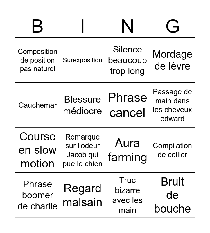 This bingo card has 16 words: Regard malsain, Compilation de collier, Silence beaucoup trop long, Composition de position pas naturel, Course en slow motion, Surexposition, Aura farming, Truc bizarre avec les main, Cauchemar, Blessure médiocre, Phrase boomer de charlie, Mordage de lèvre, Remarque sur l'odeur Jacob qui pue le chien, Passage de main dans les cheveux edward, Phrase cancel and Bruit de bouche.