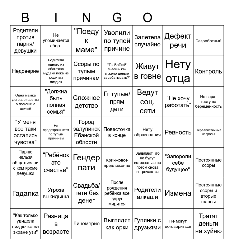 This bingo card has a free space and 48 words: Родители алкаши, Нету отца, Выглядят как орки, Не предохраняются по тупым причинам, Сложное детство, Нереалистичные запросы, Не упоминается аборт, Разница в возрасте, Дефект речи, Кринжовое предложение, Безработный, Уволили по тупой причине, "Не хочу работать", Ведут соц. сети, Гадалка, Ревность, Недоверие, Контроль, Измена, Залетела случайно, Живут в говне, Город залупинск Ебанской облости, Родители против парня/девушки, Родители одного из ебантяев мудаки пока не родится пиздюк, Постоянные ссоры и вторые шансы, Ссоры по тупым причинам, Не верят тесту на беременность, "Как только увидела пиздючка на экране узи", Гг тупые/прям дети, "Должна быть полная семья", Не могут договориться, Нету образования, Постоянные ссоры, Угроза выкидыша, "У меня всё таки остались чувства", Заявляют что не будут встречаться но потом снова встречаются, "Запороли себе будущее", Одна мамка договаривается о помощи с другой, Гендер пати, Свадьба/пати без денег, Парню нельзя общаться ни с кем кроме девушки, Тратят деньги на хуйню, "Поеду к маме", Лицемерие, "Ты ВаПщЕ знаешь как тяжело деньги зарабатывать?", После рождения ребёнка все вдруг мирятся, "Ребёнок это счастье" and Гулянки с друзьями.