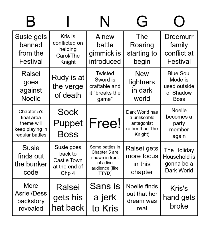 This bingo card has a free space and 24 words: Susie goes back to Castle Town at the end of Chp 4, Ralsei gets his hat back, Twisted Sword is craftable and it "breaks the game", More Asriel/Dess backstory revealed, Dreemurr family conflict at Festival, Susie gets banned from the Festival, Ralsei goes against Noelle, Kris is conflicted on helping Carol/The Knight, Dark World has a unlikeable antagonist (other than The Knight), Some battles in Chapter 5 are shown in front of a live audience (like TTYD), New lightners in dark world, Chapter 5's final area theme will keep playing in regular battles, Ralsei gets more focus in this chapter, The Holiday Household is gonna be a Dark World, Rudy is at the verge of death, Noelle finds out that her dream was real, Noelle becomes a party member again, A new battle gimmick is introduced, Blue Soul Mode is used outside of Shadow Boss, Sock Puppet Boss, Kris's hand gets broke, Susie finds out the bunker code, The Roaring starting to begin and Sans is a jerk to Kris.