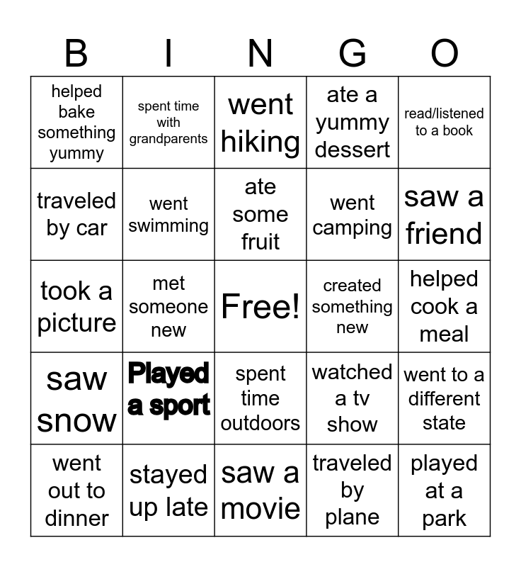 This bingo card has a free space and 24 words: Played a sport, stayed up late, ate some fruit, went out to dinner, read/listened to a book, helped bake something yummy, traveled by car, spent time with grandparents, created something new, spent time outdoors, went camping, took a picture, watched a tv show, went to a different state, went swimming, traveled by plane, helped cook a meal, went hiking, saw a friend, met someone new, played at a park, saw snow, ate a yummy dessert and saw a movie.