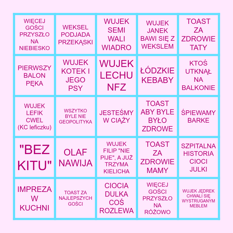 This bingo card has a free space and 24 words: OLAF NAWIJA, TOAST ZA NAJLEPSZYCH GOŚCI, WUJEK LECHU NFZ, IMPREZA W KUCHNI, TOAST ZA ZDROWIE TATY, WIĘCEJ GOŚCI PRZYSZŁO NA NIEBIESKO, PIERWSZY BALON PĘKA, WEKSEL PODJADA PRZEKĄSKI, TOAST ABY BYLE BYŁO ZDROWE, WUJEK FILIP "NIE PIJE", A JUŻ TRZYMA KIELICHA, ŁÓDZKIE KEBABY, WUJEK LEFIK CWEL (KC leficzku), TOAST ZA ZDROWIE MAMY, SZPITALNA HISTORIA CIOCI JULKI, WUJEK KOTEK I JEGO PSY, WIĘCEJ GOŚCI PRZYSZŁO NA RÓŻOWO, ŚPIEWAMY BARKE, WUJEK SEMI WALI WIADRO, KTOŚ UTKNĄŁ NA BALKONIE, WSZYTKO BYLE NIE GEOPOLITYKA, WUJEK JĘDREK CHWALI SIĘ WYSTRUGANYM MEBLEM, "BEZ KITU", WUJEK JANEK BAWI SIĘ Z WEKSLEM and CIOCIA DULKA COŚ ROZLEWA.