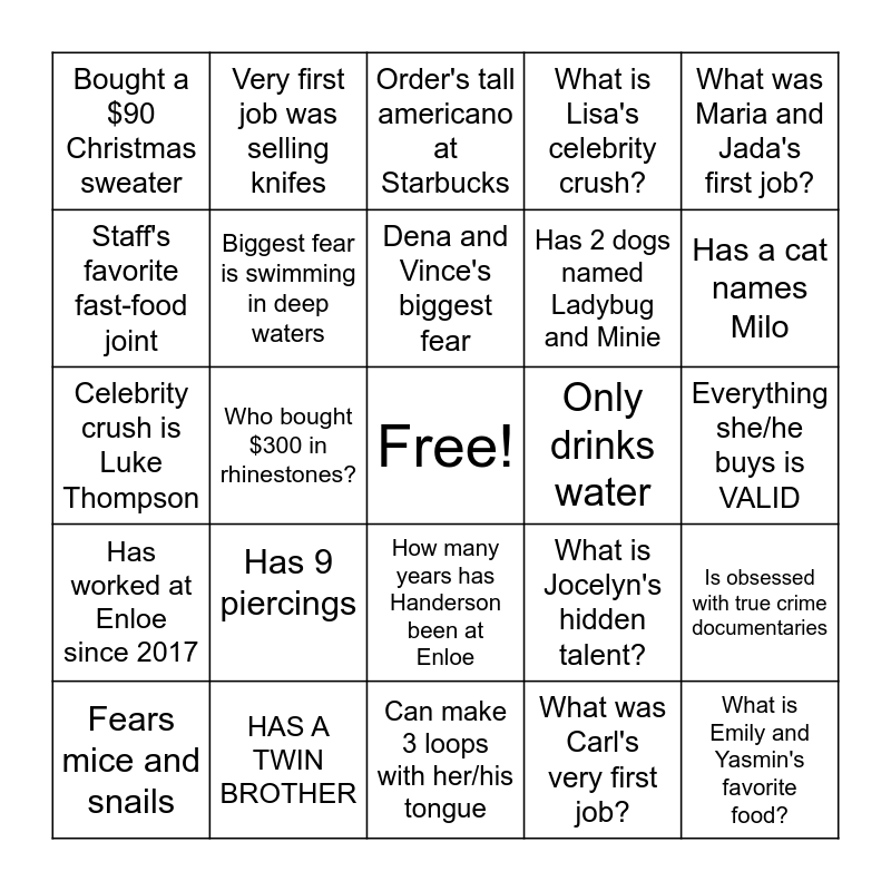 This bingo card has a free space and 24 words: Has 9 piercings, HAS A TWIN BROTHER, Dena and Vince's biggest fear, Fears mice and snails, What was Maria and Jada's first job?, Bought a $90 Christmas sweater, Staff's favorite fast-food joint, Very first job was selling knifes, Only drinks water, How many years has Handerson been at Enloe, Has 2 dogs named Ladybug and Minie, Celebrity crush is Luke Thompson, What is Jocelyn's hidden talent?, Is obsessed with true crime documentaries, Biggest fear is swimming in deep waters, What was Carl's very first job?, Everything she/he buys is VALID, Order's tall americano at Starbucks, Has a cat names Milo, Who bought $300 in rhinestones?, What is Emily and Yasmin's favorite food?, Has worked at Enloe since 2017, What is Lisa's celebrity crush? and Can make 3 loops with her/his tongue.