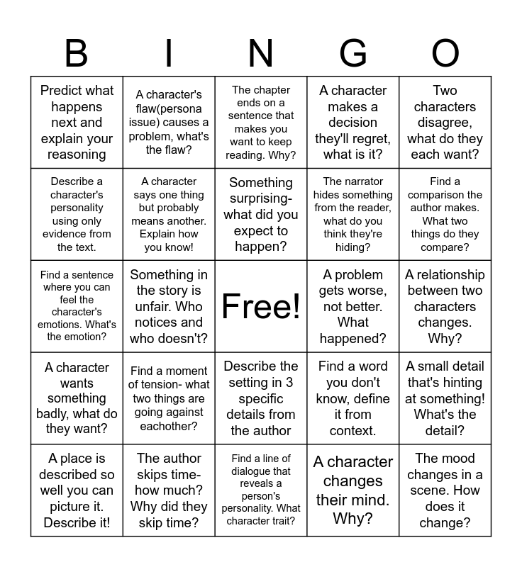 This bingo card has a free space and 24 words: Find a moment of tension- what two things are going against eachother?, The author skips time- how much? Why did they skip time?, Something surprising- what did you expect to happen?, A place is described so well you can picture it. Describe it!, Two characters disagree, what do they each want?, Predict what happens next and explain your reasoning, Describe a character's personality using only evidence from the text., A character's flaw(persona issue) causes a problem, what's the flaw?, A problem gets worse, not better. What happened?, Describe the setting in 3 specific details from the author, The narrator hides something from the reader, what do you think they're hiding?, Find a sentence where you can feel the character's emotions. What's the emotion?, Find a word you don't know, define it from context., A small detail that's hinting at something! What's the detail?, A character says one thing but probably means another. Explain how you know!, A character changes their mind. Why?, A relationship between two characters changes. Why?, The chapter ends on a sentence that makes you want to keep reading. Why?, Find a comparison the author makes. What two things do they compare?, Something in the story is unfair. Who notices and who doesn't?, The mood changes in a scene. How does it change?, A character wants something badly, what do they want?, A character makes a decision they'll regret, what is it? and Find a line of dialogue that reveals a person's personality. What character trait?.