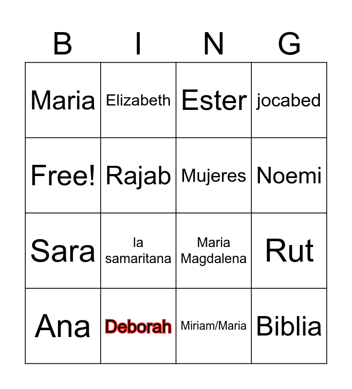 This bingo card has 16 words: Deborah, Rut, Ester, Maria, Sara, Elizabeth, Maria Magdalena, Miriam/Maria, Free!, Rajab, Ana, jocabed, la samaritana, Noemi, Mujeres and Biblia.