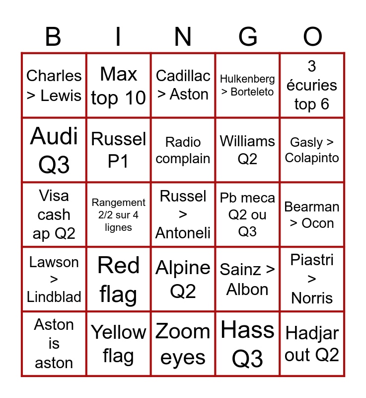 This bingo card has a free space and 24 words: Red flag, Yellow flag, Radio complain, Aston is aston, 3 écuries top 6, Charles > Lewis, Audi Q3, Max top 10, Pb meca Q2 ou Q3, Alpine Q2, Williams Q2, Visa cash ap Q2, Sainz > Albon, Piastri > Norris, Russel P1, Hass Q3, Bearman > Ocon, Cadillac > Aston, Gasly > Colapinto, Rangement 2/2 sur 4 lignes, Hadjar out Q2, Lawson > Lindblad, Hulkenberg > Borteleto and Zoom eyes.