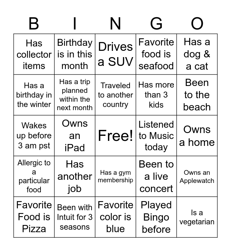 This bingo card has a free space and 34 words: Had Hot Tea today, Played Bingo before, Favorite Ice Cream is Butter Pecan, Wears glasses, Allergic to a particular food, Has a trip planned within the next month, Has a dog & a cat, Favorite Food is Pizza, Birthday is in this month, Owns a car, Traveled to another country, Drives a SUV, Has a Galaxy Samsung, Favorite music is country music, Listened to Music today, Been to the beach, Been with Intuit for 3 seasons, Wakes up before 3 am pst, Has another job, Been to a live concert, Has a gym membership, Has on the color red, Has collector items, Owns a home, Favorite color is blue, Is a vegetarian, Favorite food is seafood, Over the age of 50, Has more than 3 kids, Has a birthday in the winter, Received over $100 in spotlights for 1 season, Owns an iPad, Owns an Applewatch and Been to a casino.