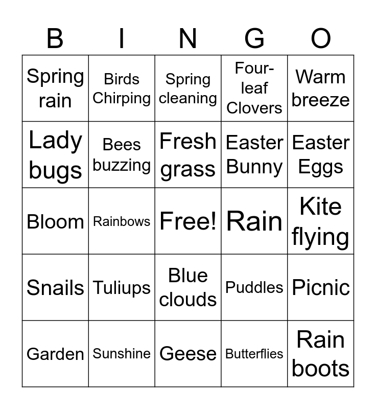 This bingo card has a free space and 24 words: Tuliups, Sunshine, Fresh grass, Garden, Warm breeze, Spring rain, Lady bugs, Birds Chirping, Rain, Blue clouds, Easter Bunny, Bloom, Puddles, Picnic, Bees buzzing, Butterflies, Kite flying, Spring cleaning, Easter Eggs, Rainbows, Rain boots, Snails, Four-leaf Clovers and Geese.