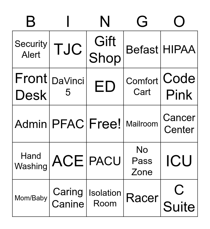 This bingo card has a free space and 24 words: ACE, Caring Canine, ED, Mom/Baby, HIPAA, Security Alert, Front Desk, TJC, Mailroom, PACU, Comfort Cart, Admin, No Pass Zone, ICU, DaVinci 5, Racer, Cancer Center, Gift Shop, Code Pink, PFAC, C Suite, Hand Washing, Befast and Isolation Room.