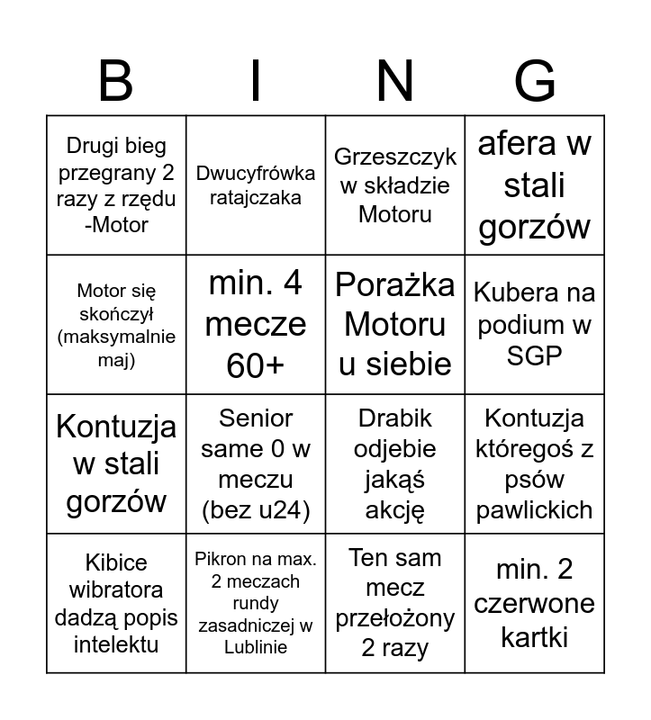This bingo card has 16 words: Pikron na max. 2 meczach rundy zasadniczej w Lublinie, Kontuzja któregoś z psów pawlickich, Grzeszczyk w składzie Motoru, Drugi bieg przegrany 2 razy z rzędu -Motor, Kontuzja w stali gorzów, Dwucyfrówka ratajczaka, Drabik odjebie jakąś akcję, Ten sam mecz przełożony 2 razy, Motor się skończył (maksymalnie maj), min. 4 mecze 60+, Kibice wibratora dadzą popis intelektu, afera w stali gorzów, Senior same 0 w meczu (bez u24), Kubera na podium w SGP, Porażka Motoru u siebie and min. 2 czerwone kartki.