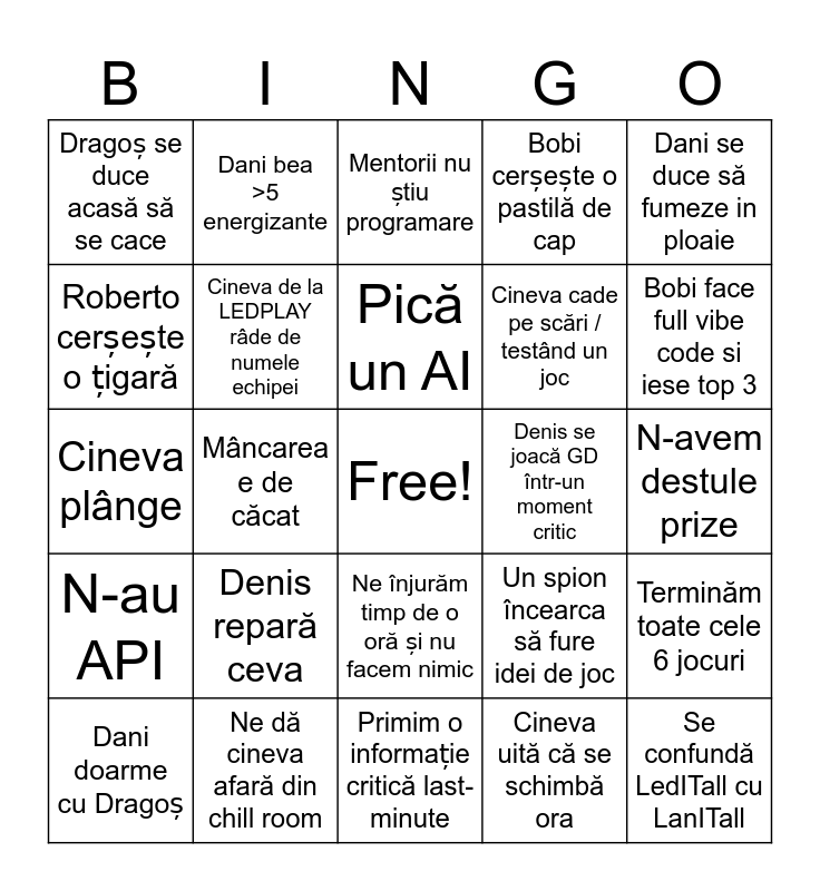 This bingo card has a free space and 24 words: Denis repară ceva, Ne dă cineva afară din chill room, Pică un AI, Dani doarme cu Dragoș, Dani se duce să fumeze in ploaie, Dragoș se duce acasă să se cace, Roberto cerșește o țigară, Dani bea >5 energizante, Denis se joacă GD într-un moment critic, Ne înjurăm timp de o oră și nu facem nimic, Cineva cade pe scări / testând un joc, Cineva plânge, Un spion încearca să fure idei de joc, Terminăm toate cele 6 jocuri, Cineva de la LEDPLAY râde de numele echipei, Cineva uită că se schimbă ora, N-avem destule prize, Mentorii nu știu programare, Bobi face full vibe code si iese top 3, Mâncarea e de căcat, Se confundă LedITall cu LanITall, N-au API, Bobi cerșește o pastilă de cap and Primim o informație critică last-minute.