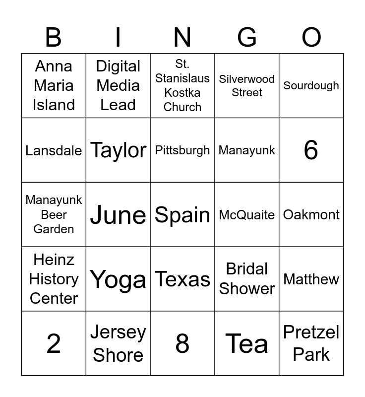 This bingo card has a free space and 38 words: Penn State, THON, Millie, Taylor, Matthew, Yoga, Pittsburgh, Philadelphia, Sourdough, Manayunk, June, Silverwood Street, Pretzel Park, Oakmont, Lansdale, Heinz History Center, Sienna Mercato, St. Stanislaus Kostka Church, Mazeski, McQuaite, Anna Maria Island, Jersey Shore, 6, 2, 11, 8, Golf, May, September, Kiawah Island, Sea Isle City, Texas, Tea, Digital Media Lead, Baby Riley, Bridal Shower, Manayunk Beer Garden and Marry Me.