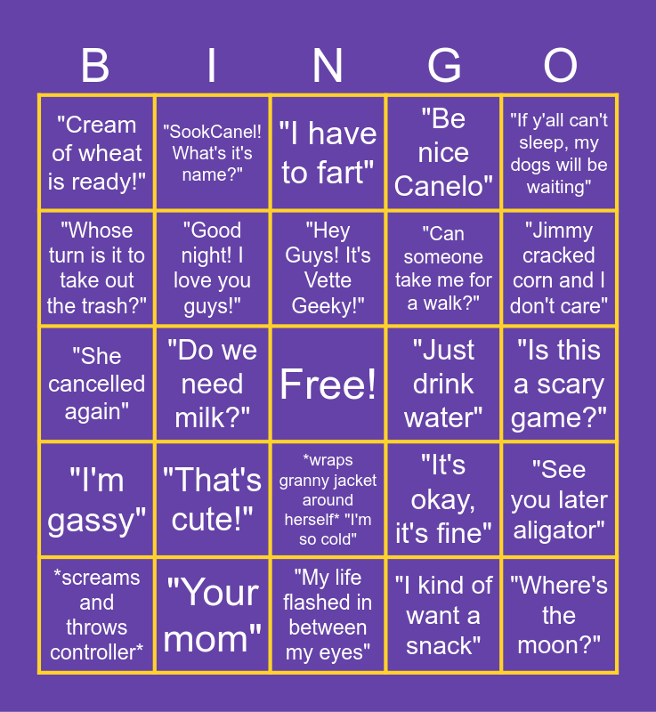 This bingo card has a free space and 25 words: "That's cute!", "My life flashed in between my eyes", "Hey Guys! It's Vette Geeky!", *screams and throws controller*, "If y'all can't sleep, my dogs will be waiting", "Cream of wheat is ready!", "Whose turn is it to take out the trash?", "SookCanel! What's it's name?", "Just drink water", *wraps granny jacket around herself* "I'm so cold", "Can someone take me for a walk?", "She cancelled again", "It's okay, it's fine", "See you later aligator", "Good night! I love you guys!", "I gotta get my steps in", "Is this a scary game?", "I have to fart", "Jimmy cracked corn and I don't care", "Do we need milk?", "Where's the moon?", "Your mom", "I'm gassy", "Be nice Canelo" and "I kind of want a snack".