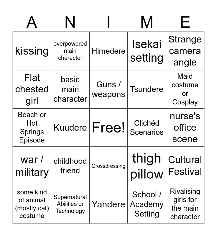 This bingo card has a free space and 28 words: Cultural Festival, Accidental Pervert Trope, Tsundere, School / Academy Setting, Flat chested girl, Himedere, overpowered main character, war / military, Clichéd Scenarios, some kind of animal (mostly cat) costume, Beach or Hot Springs Episode, Isekai setting, Supernatural Abilities or Technology, Yandere, Maid costume or Cosplay, twin tailed girl, childhood friend, basic main character, Guns / weapons, Crossdressing, kissing, swimsuit buying episode, Rivalising girls for the main character, Kuudere, nurse's office scene, thigh pillow, Strange camera angle and feeding the other gender.