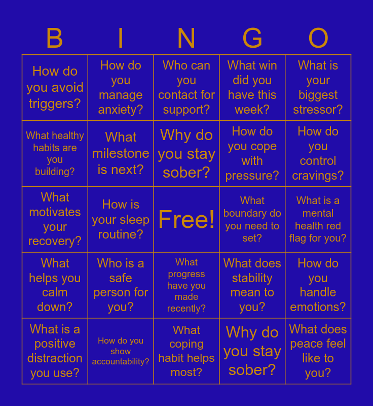 This bingo card has a free space and 25 words: Who is a safe person for you?, What coping habit helps most?, Why do you stay sober?, What is a positive distraction you use?, What is your biggest stressor?, How do you avoid triggers?, What healthy habits are you building?, How do you manage anxiety?, What boundary do you need to set?, What progress have you made recently?, How do you cope with pressure?, What motivates your recovery?, What does stability mean to you?, How do you handle emotions?, What milestone is next?, What is a sign you're struggling mentally?, What is a mental health red flag for you?, Who can you contact for support?, How do you control cravings?, How is your sleep routine?, What does peace feel like to you?, How do you show accountability?, What helps you calm down?, What win did you have this week? and Why do you stay sober?.