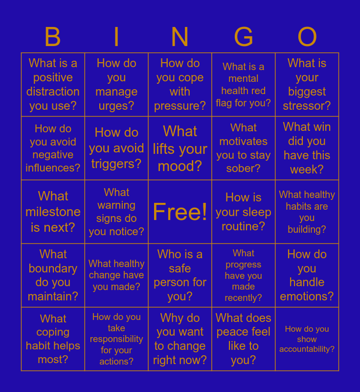 This bingo card has a free space and 24 words: What healthy change have you made?, How do you take responsibility for your actions?, What lifts your mood?, What coping habit helps most?, What is your biggest stressor?, What is a positive distraction you use?, How do you avoid negative influences?, How do you manage urges?, How is your sleep routine?, Who is a safe person for you?, What motivates you to stay sober?, What milestone is next?, What progress have you made recently?, How do you handle emotions?, How do you avoid triggers?, What does peace feel like to you?, What healthy habits are you building?, How do you cope with pressure?, What win did you have this week?, What warning signs do you notice?, How do you show accountability?, What boundary do you maintain?, What is a mental health red flag for you? and Why do you want to change right now?.