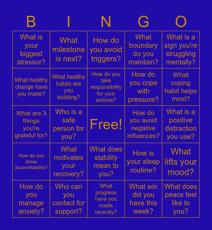 This bingo card has a free space and 24 words: What motivates your recovery?, Who can you contact for support?, How do you take responsibility for your actions?, How do you manage anxiety?, What is a sign you're struggling mentally?, What is your biggest stressor?, What healthy change have you made?, What milestone is next?, How do you avoid negative influences?, What does stability mean to you?, How do you cope with pressure?, What are 3 things you're grateful for?, How is your sleep routine?, What lifts your mood?, What healthy habits are you building?, What win did you have this week?, What is a positive distraction you use?, How do you avoid triggers?, What coping habit helps most?, Who is a safe person for you?, What does peace feel like to you?, How do you show accountability?, What boundary do you maintain? and What progress have you made recently?.