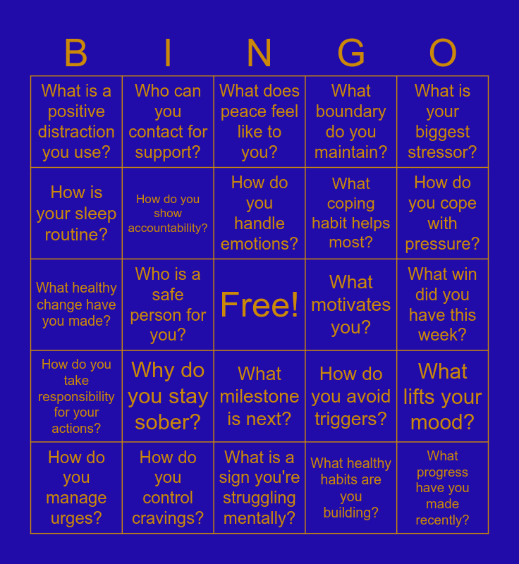 This bingo card has a free space and 24 words: Why do you stay sober?, How do you control cravings?, How do you handle emotions?, How do you manage urges?, What is your biggest stressor?, What is a positive distraction you use?, How is your sleep routine?, Who can you contact for support?, What motivates you?, What milestone is next?, What coping habit helps most?, What healthy change have you made?, How do you avoid triggers?, What lifts your mood?, How do you show accountability?, What healthy habits are you building?, What win did you have this week?, What does peace feel like to you?, How do you cope with pressure?, Who is a safe person for you?, What progress have you made recently?, How do you take responsibility for your actions?, What boundary do you maintain? and What is a sign you're struggling mentally?.