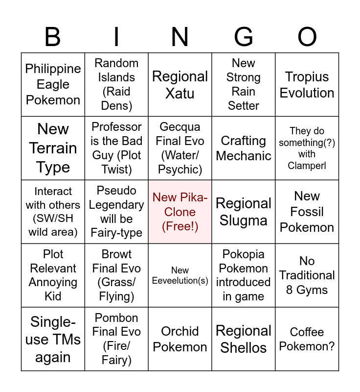 This bingo card has a free space and 24 words: Browt Final Evo (Grass/ Flying), Pombon Final Evo (Fire/ Fairy), Gecqua Final Evo (Water/ Psychic), Single-use TMs again, Tropius Evolution, Philippine Eagle Pokemon, New Terrain Type, Random Islands (Raid Dens), Regional Slugma, New Eeveelution(s), Crafting Mechanic, Interact with others (SW/SH wild area), Pokopia Pokemon introduced in game, No Traditional 8 Gyms, Professor is the Bad Guy (Plot Twist), Regional Shellos, New Fossil Pokemon, Regional Xatu, They do something(?) with Clamperl, Pseudo Legendary will be Fairy-type, Coffee Pokemon?, Plot Relevant Annoying Kid, New Strong Rain Setter and Orchid Pokemon.