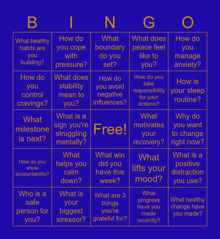 This bingo card has a free space and 24 words: What helps you calm down?, What is your biggest stressor?, How do you avoid negative influences?, Who is a safe person for you?, How do you manage anxiety?, What healthy habits are you building?, How do you control cravings?, How do you cope with pressure?, What motivates your recovery?, What win did you have this week?, How do you take responsibility for your actions?, What milestone is next?, What lifts your mood?, What is a positive distraction you use?, What does stability mean to you?, What progress have you made recently?, Why do you want to change right now?, What boundary do you set?, How is your sleep routine?, What is a sign you're struggling mentally?, What healthy change have you made?, How do you show accountability?, What does peace feel like to you? and What are 3 things you're grateful for?.