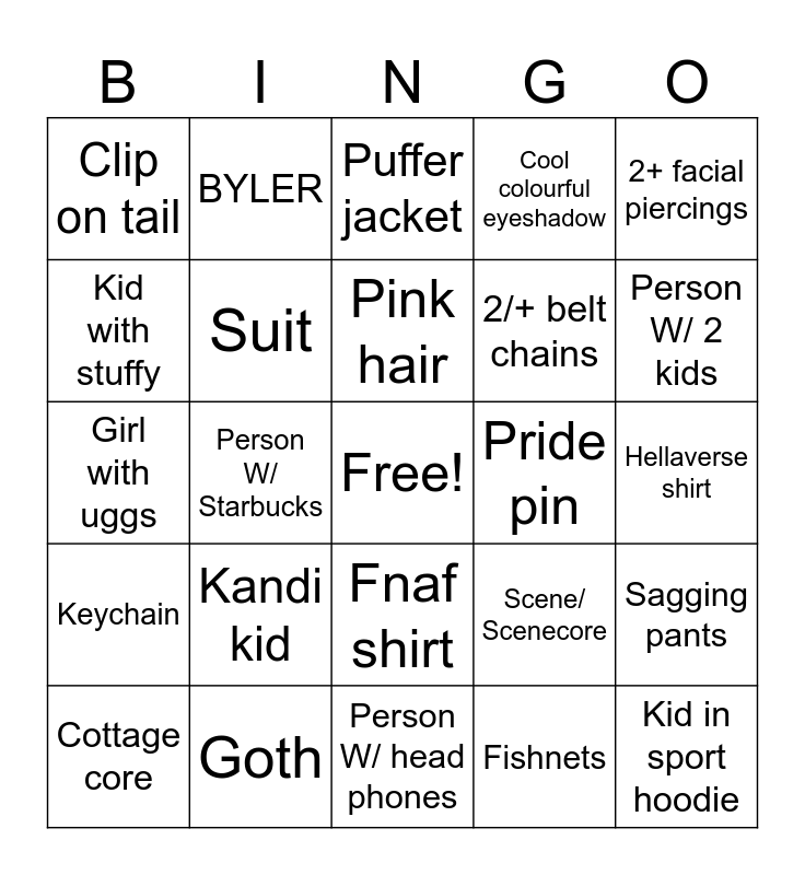 This bingo card has a free space and 24 words: Kandi kid, Goth, Pink hair, Cottage core, 2+ facial piercings, Clip on tail, Kid with stuffy, BYLER, Pride pin, Fnaf shirt, 2/+ belt chains, Girl with uggs, Scene/ Scenecore, Sagging pants, Suit, Fishnets, Hellaverse shirt, Puffer jacket, Person W/ 2 kids, Person W/ Starbucks, Kid in sport hoodie, Keychain, Cool colourful eyeshadow and Person W/ head phones.