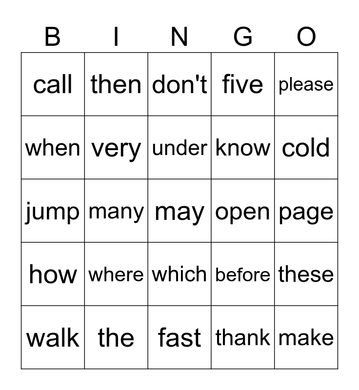 This bingo card has a free space and 24 words: where, the, under, walk, please, call, when, then, open, which, know, jump, before, these, very, thank, page, don't, cold, many, make, how, five and fast.