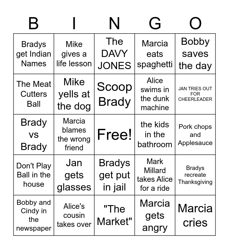 This bingo card has a free space and 24 words: Jan gets glasses, Alice's cousin takes over, Scoop Brady, Bobby and Cindy in the newspaper, Bobby saves the day, Bradys get Indian Names, The Meat Cutters Ball, Mike gives a life lesson, the kids in the bathroom, Bradys get put in jail, Alice swims in the dunk machine, Brady vs Brady, Mark Millard takes Alice for a ride, Bradys recreate Thanksgiving, Mike yells at the dog, Marcia gets angry, Pork chops and Applesauce, The DAVY JONES, JAN TRIES OUT FOR CHEERLEADER, Marcia blames the wrong friend, Marcia cries, Don't Play Ball in the house, Marcia eats spaghetti and "The Market".