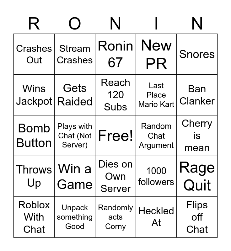 This bingo card has a free space and 24 words: Win a Game, Unpack something Good, Reach 120 Subs, Roblox With Chat, Snores, Crashes Out, Wins Jackpot, Stream Crashes, Random Chat Argument, Dies on Own Server, Last Place Mario Kart, Bomb Button, 1000 followers, Rage Quit, Gets Raided, Heckled At, Cherry is mean, Ronin 67, Ban Clanker, Plays with Chat (Not Server), Flips off Chat, Throws Up, New PR and Randomly acts Corny.